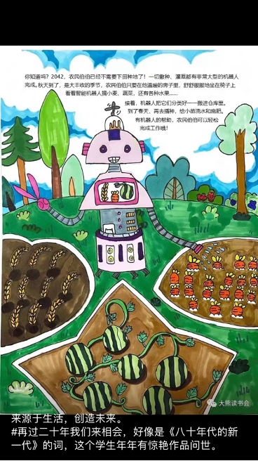 In 2022, an elementary teacher friend in Shenzhen, China’s first special economic zone (SEZ), shared a mini graphic novel by a third-grader on WeChat titled Happy 2042 (Kuaile de 2042 快樂的2042). On the cover page, a little girl points an index finger up to the sky, with a pink robot on her left. Together, they look upward at the title rendered through symbols resembling tubes, space ships, and planets. Below, an ascending rocket and a flying car with wings sit on each side of the author’s name, Feng Qianyun 馮芊允. On the first page, the little girl receives a message in a bottle from 2042 that says: “In the world of 2042, everyone is living in this high-tech happy land.” The pages go on to depict robots planting crops and serving in restaurants while drones help with door-to-door delivery (Figure 1).