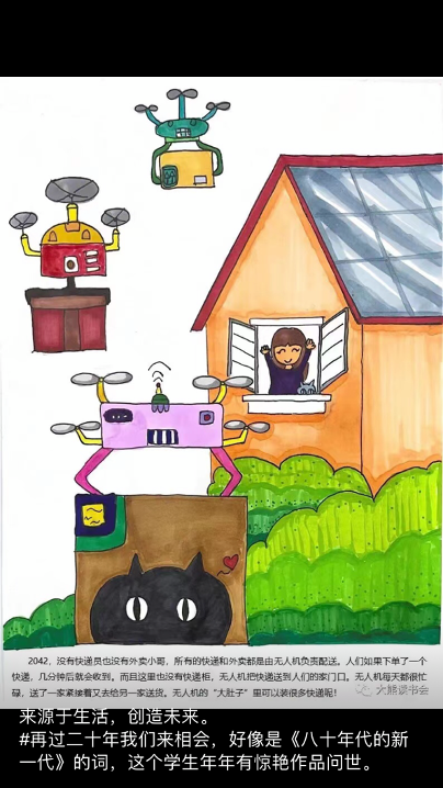 My friend introduced the illustrations as “originating from life, creating the future,” recalling that “let’s meet in 20 years” sounds like a popular song from the 1980s, “Young friends coming together to meet” (nianqing de pengyou lai xianghui 年輕的朋友 來相會). Written in 1980 at the onset of reform and opening up, the uplifting song with bright tones and exuberant rhythms was familiar to many of us growing up in that era. One line, for example, says, “On whom does the creation of miracles rely? On me, on you, on us, the new generation of the 1980s.” The same sense of optimism is shared in the mini graphic novel, except that the human protagonist is encountering a new round of miracles 20 more years into the future. This time, the central figures depicted in this future appear to be numerous human-made nonhuman agents, most prominently robots and drones.