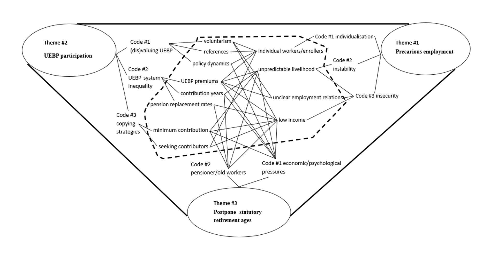 The most important aspects of the raw data were marked as key phrases (within the dashed lines in the figure below), and then summarised or classified into codes and themes (Code #x and Theme #x, respectively). For example, the potential reasons for the code of “(dis)valuing UEBP” were identified as rural background, age, and work-unit experience, yet the comparison showed that work-unit experience was most influential. Therefore, “individual workers/enrollers” was kept in the figure while others were omitted. In this process, the relationships between key phrases were also identified (see the networks in the figure). For example, “individual workers/enrollers” could participate in the UEBP voluntarily (“voluntarism”), had fewer “references” for learning about the UEBP, and were sensitive to “policy dynamics,” which explains why “individualisation” is linked to “(dis)valuing UEBP.”