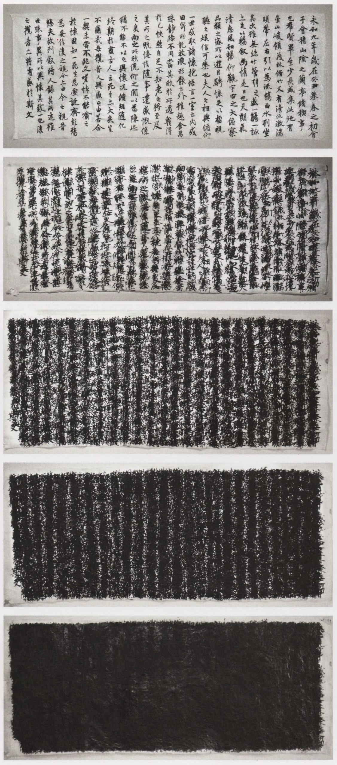 Figure 2. Below: The wider diffusion of the emblematic work happened through rubbings of models engraved after the handwritten early copies, such as this Song dynasty rubbing. Palace Museum, Beijing. Credits: courtesy of the Palace Museum, artifact No. 46685.