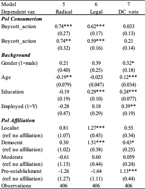 To compare the patterns of political consumerism with the usual forms of political participation, respondents were asked to rate on a scale of 0 to 3 (0 = never; 3 = always) whether they had participated in “any legal actions during the anti-extradition bill movements, such as rallies and protests?” (Legal), or in “any radical actions during the anti-extradition bill movement?” (Radical).[23] For institutionalised/formal participation, a dummy variable was used (DC_vote) to indicate whether they had voted in the District Council election in December 2019.