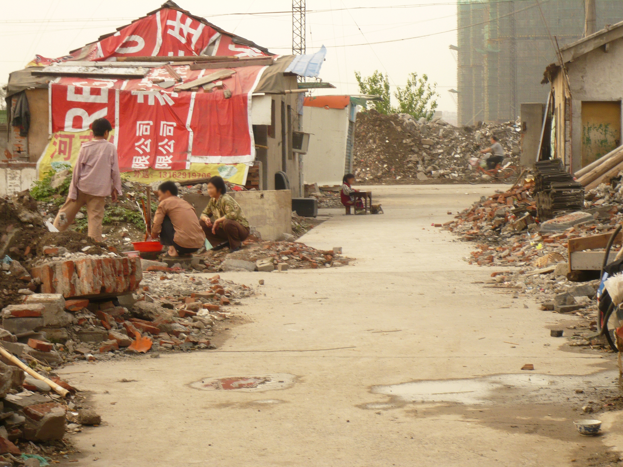 Stroll through the neighbourhood in the evening after the lesson – Ni Zheng insists on accompanying me back to the bus station, a quarter of an hour away. He spontaneously suggests we enter the area of wasteland, taking us a little out of our way. As we walk through the very heart of the demolition zone, he remarks: “Here is like Sichuan after the earthquake.” We go to the house of one of his friends, another pupil from the old school, but it is also the place where he used to live before – as we are climbing a little staircase to enter his neighbours’ room which is upstairs, he says, “My house was there,” pointing out a place right next to it that had been destroyed. Then he pushes open the door, hesitantly nonetheless, at the same time as he glances inside and announces his arrival. The mother is getting ready to wash her son and they are watching TV. The mother greets me very graciously, and when Ni Zheng tells her I give him lessons, she asks me if I live nearby. (…) I’m on my way, out of politeness Ni Zheng asks me if I can find my way. I leave, all three come out onto the doorstep to say goodbye before going back in to watch TV. (Field notes, Friday 6 June 2008)[1]