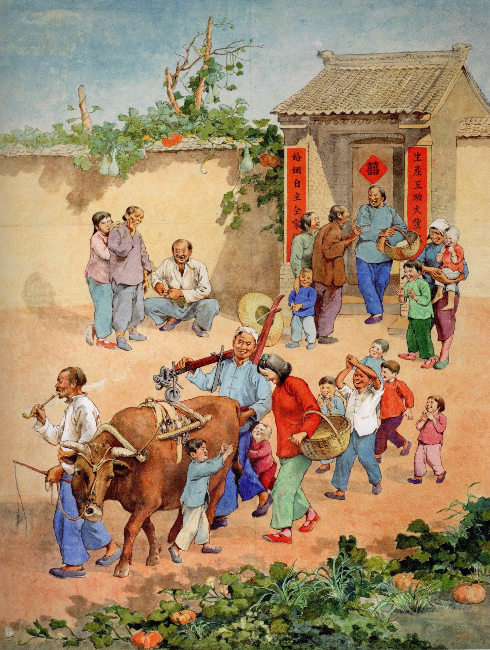 The 1952 painting Happy Marriage (Xingfu hunyin 幸福婚姻, Figure 1)[1] depicts a scene of unambiguous jubilance. Walking behind their healthy ox through a throng of clamouring children, a newlywed couple reveals their joy – and a bit of embarrassment – through their wide smiles. As they embark on a new life together, their relaxed body language suggests that they are bound not by tradition but by free choice, a distinction that would lead to a happy union and prosperous future. Thematically consistent with a fertile vegetable patch in the foreground, an auspicious couplet flanking the gate of the couple’s courtyard declares: “Working together makes a bumper harvest, marrying the partner of one’s choice leads to a happy family” (Shengchan huzhu da fengshou, hunyin zizhu quanjiafu 生產互助大豐收, 婚姻自主全家福). Reinforced by the couplet, this painting yokes traditional auspicious sentiment and Maoist messaging. The image was created by the Xi’an-based official artist Shi Lu 石魯 (1919-1982) in the style of a New Year’s picture (nianhua 年畫), a genre of folk art that gained modern footing when it was professionalised and popularised by political establishments of twentieth-century China.[2]
