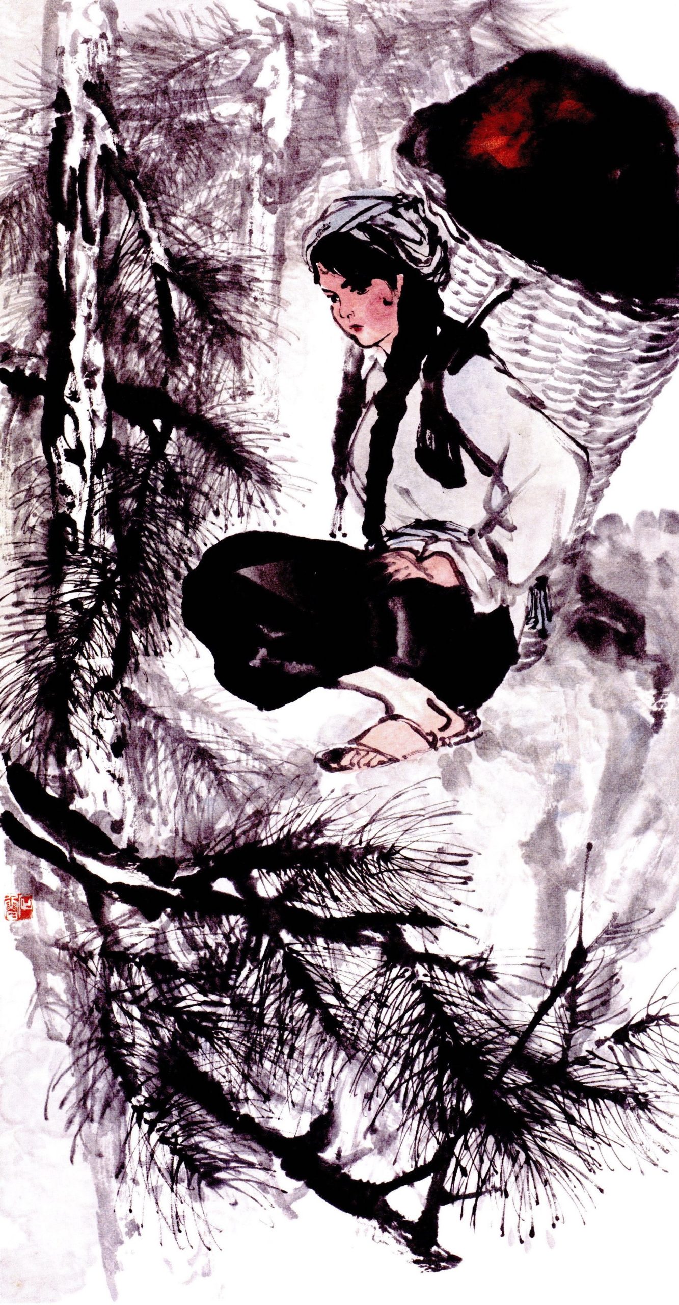 The strangeness of the coal-carrying figure is further emphasised by the setting, a shallow space framed by aggressively rendered trees and rocks that enclose the figure in a threatening manner. The figure’s fixed gaze is at once determined and anxious; yet she is clearly embedded in this environment. The placement of an anonymous peasant girl in a gesturally painted ink landscape with pines trees, a symbolic motif typically reserved for the literati, shows Shi Lu’s deliberate break from convention to create a painting that is a bricolage of ink traditions, Western realism, and socialist subject matter.