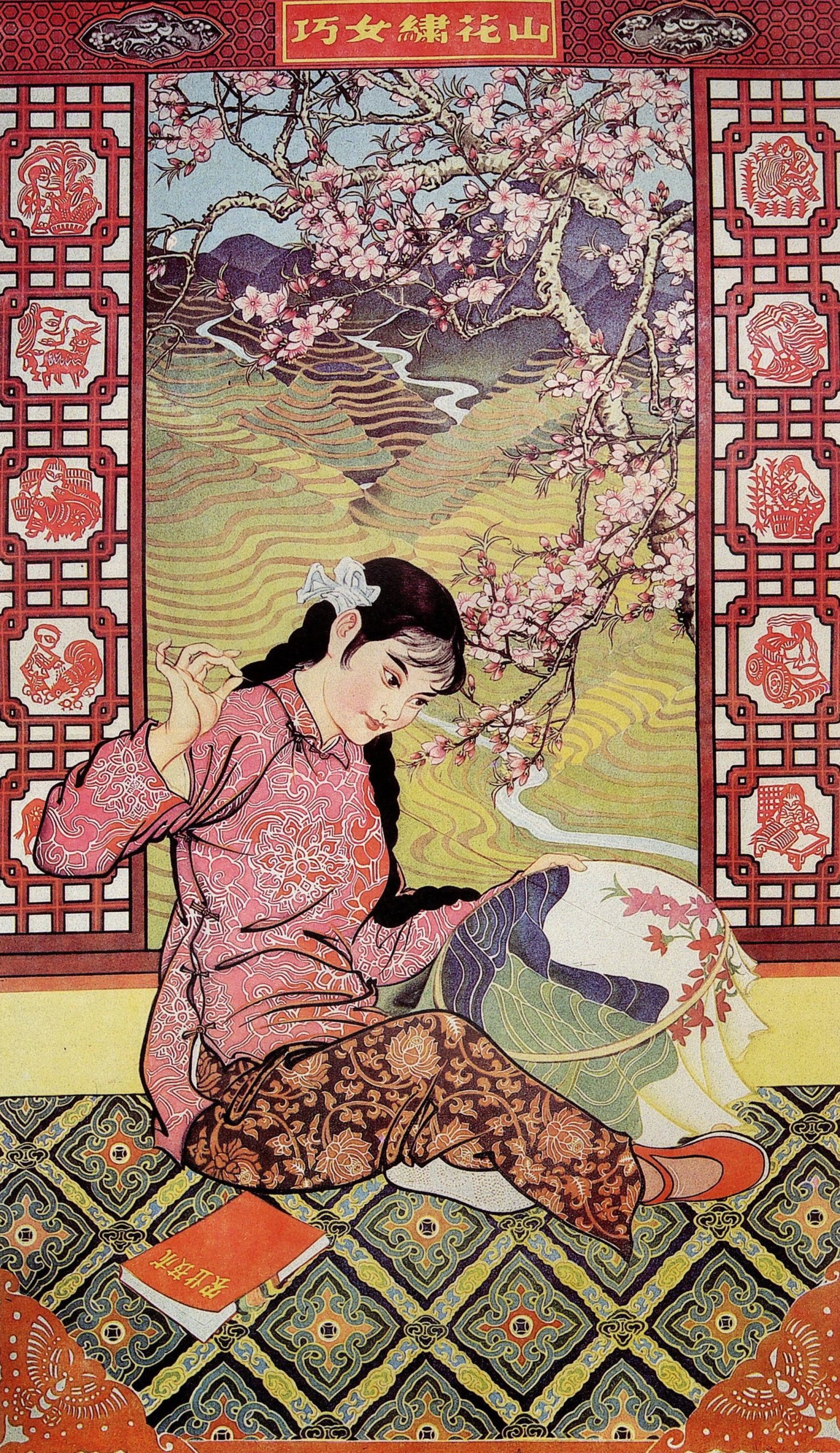 Figure 6. Shi Lu 石魯, Clever Girl Embroidering the Landscape (Qiao nü xiu hua shan 巧女繡花山). 1959. New Year’s picture (nianhua). 75 x 43 cm. Credit: Shi Dan.