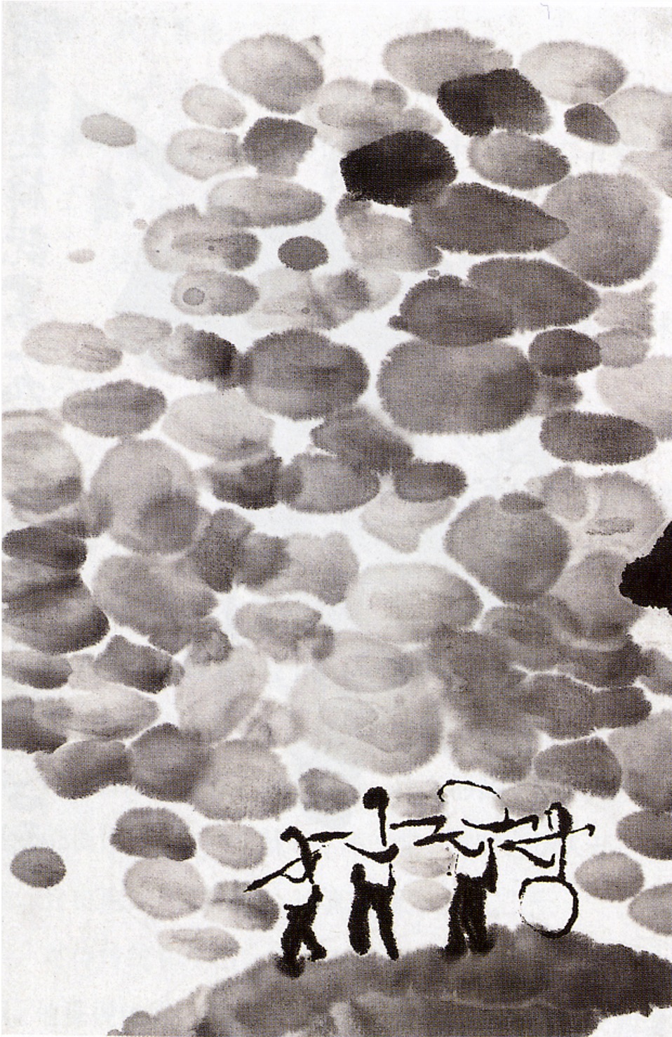 The establishment of young peasant girls as a common socialist visual type enabled viewers to recognise the female form as a gestalt in works such as Looking at Grasshopper and On the Way to Work (Shang gong 上工, Figure 9). Despite their abstract style rendered in dabs of wet ink monochrome, the forms in the lower section of the latter painting are legible as young women. Even without a clear view of the subject’s face or body, the viewer can immediately recognise peasant girls via long braids, as well as their boxy, often red, cotton jackets. The ready acceptance of these simple forms as representational suggests the normalisation of peasants in early PRC visual culture. In On the Way to Work, in particular, the relationship between the landscape and figures restores the ratio of traditional painting. The faceless, anonymous young women hold the same compositional importance as the contemplating scholar in premodern painting. Instead of a distinguished gentleman-scholar, the central figures are young women of modest means who have earned their value as artistic subjects in Maoist China through their industrious contribution to a socialist society.