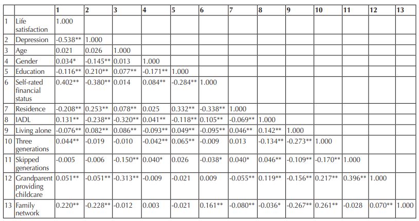 A profile of the samples in this study is shown in Table 1. Participants’ ages ranged from 65 to 103 (mean = 76.2, SD = 7.2). Male participants comprised 46.8% of the sample, and females made up 53.2%. The majority of the participants had a low level of education, having attended only primary school or below (71.5%). Only 28.5% of the participants had attended middle school or above. Regarding self-rated financial status, 4.7% rated their financial status as very poor, 28.1% rated it as poor, 53.6% rated it as roughly adequate, and 13.6% rated it as other. Approximately 60% of the participants were urban residents. The mean score of the IADL was 6.8 (SD = 2.2) ranging from 0 to 8. Regarding living arrangement, 14.8% lived alone, 29.9% lived with their grandchildren and adult children in a three-generation family, and 6.4% lived with their grandchildren only in skipped-generation families. A total of 16.0% of the participants provided care for grandchildren. The mean score for the family network was 10.8 (SD = 2.8) ranging from 0 to 15. The mean scores for life satisfaction and depression were 26.0 (SD = 6.1) and 6.7 (SD = 5.7), respectively.