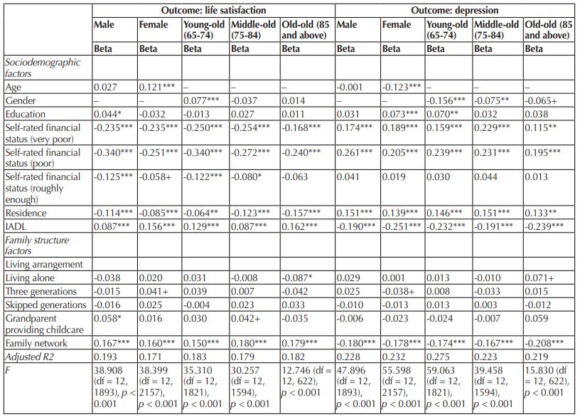 Before creating regression models, correlations for all the variables were described (shown in Table 2). We looked at the sociodemographic factors (i.e., age, gender, education, self-rated financial status, residence, and IADL), family structure factors (i.e., living arrangement, grandparent providing childcare, and family network), and dependent variables (life satisfaction and depression). By using a Pearson correlation coefficient or a Spearman’s rank correlation coefficient, participants’ gender, education, self-rated financial status, residence, IADL, living arrangement, grandparent providing childcare, and family network were found to be significantly correlated with their life satisfaction (p < 0.05); participants’ gender, education, self-rated financial status, residence, IADL, living arrangement, grandparent providing childcare, and family network were found to be significantly correlated with their depression (p < 0.05). No significant correlation was found between life satisfaction and age, and between depression and age. Moreover, we found a high correlation between life satisfaction and depression (p < 0.05, coefficient > 0.5). Our results did not reveal any other strong correlation among these potential factors.