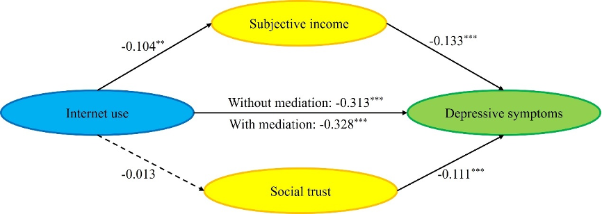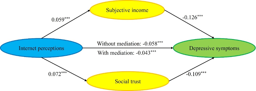 We found a robust mitigating effect of internet perceptions and use among older adults on their depressive symptoms. Subjective income played a significant mediating role in the association between internet perceptions and depressive symptoms, but a suppressing role in the correlation between internet use and depressive symptoms among older adults. It is necessary to create an age-friendly online environment for older netizens; for instance, internet platforms can use intelligent recommendation algorithms to filter out photographs or short videos depicting materialism and money orientation (Yu et al. 2022: 2).