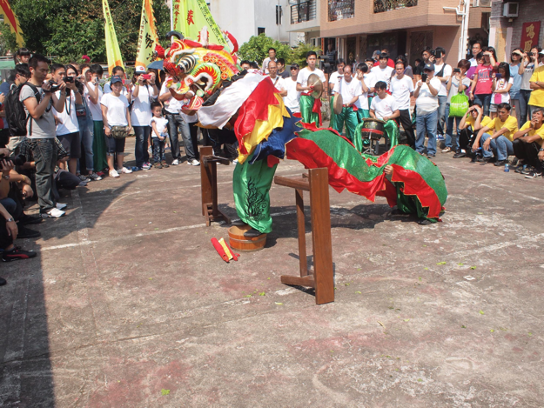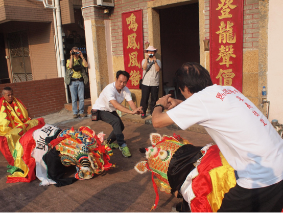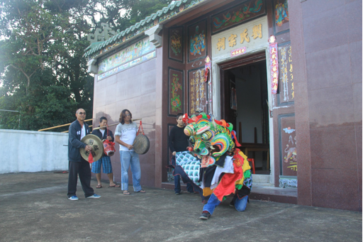 When a temple festival[23] or a communal event is organised by friends of the village,[24] the village’s unicorn troupe will pay a visit to celebrate. This is known as the “unicorn leaving its shed” (qilin chupeng 麒麟出棚) or “unicorn excursion.” At the event venue, the unicorn troupe will perform the “unicorn jump” (qilintiao 麒麟跳) and martial arts for the public audience. The unicorn jump is a dance custom of “plucking the greens” (caiqing 採青) to bring fortune for the event.[25] In the second part, all members of the unicorn troupe take turns performing martial arts for the spectators, and the event usually concludes with the performance of the master. A performance is usually completed within 30 minutes. These external visits serve an important role in maintaining the village’s social networks.