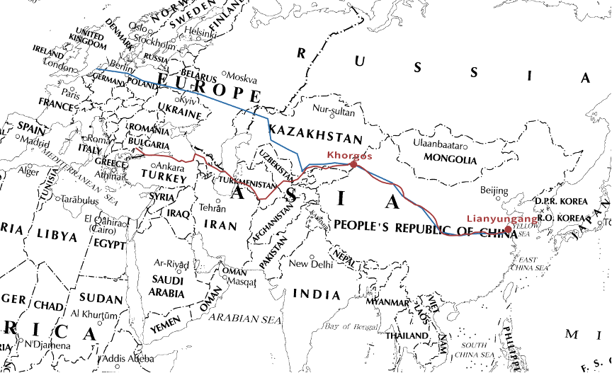 Note: the new Asia-Europe land-sea transport channel (Xin Ya Ou luhai lianyun tongdao 新亞歐陸海聯運通道) starts from Lianyungang (China) in the east and connects Eurasia through Khorgas. In the figure, the red line represents the China-Türkiye (trans-Caspian Sea) route, and the blue line represents the China-Europe route.